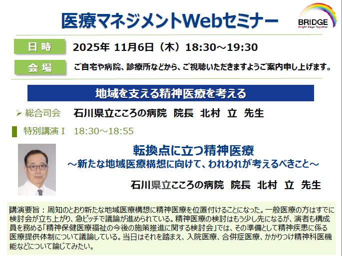 2025年11月6日(木)18:30〜19:30にオンライン開催される本セミナーは、精神医療の地域医療構想に焦 […]